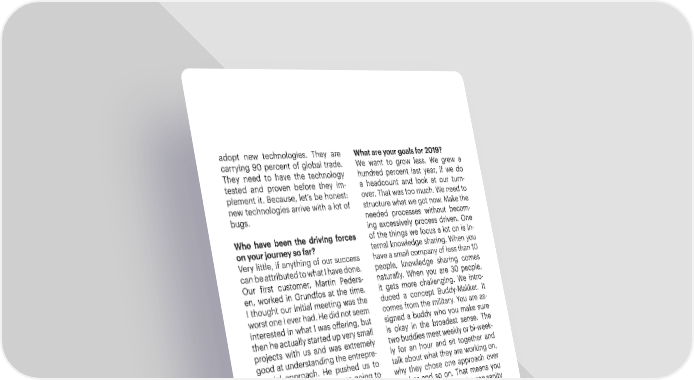 adopt new technologies. They are What are your goals for 2019? carrying 90 percent of global trade. We want to grow less. We grew a They need to have the technology hundred percent last year, if we do tested and proven before they im- a headcount and look at our turn- plement it. Because, let’s be honest: over. That was too much. We need to new technologies arrive with a lot of structure what we got now. Make the bugs. needed processes without becom- ing excessively process driven. One Who have been the driving forces of the things we focus a lot on is in- on your journey so far? ternal knowledge sharing. When you Very little, if anything of our success have a small company of less than 10 can be attributed to what I have done. people, knowledge sharing comes Our first customer, Martin Peders- naturally. When you are 30 people, en, worked in Grundfos at the time. it gets more challenging. We intro- I thought our initial meeting was the duced a concept Buddy-Makker. It worst one I ever had. He did not seem comes from the military. You are as- interested in what I was offering, but signed a buddy who you make sure then he actually started up very small is okay in the broadest sense. The projects with us and was extremely two buddies meet weekly or bi-week- good at understanding the entrepre- ly for an hour and sit together and neurial approach. He pushed us to talk about what they are working on, define what it was we were going to why they chose one approach over deliver and not charge too much. He another and so on. That means you was really a guiding force in how to always have someone who can sanity build a project. 90% of what I know check what you are doing and have a comes from what I learned in that way of transferring knowledge from period from him. Martin is part of one project to another - something our advisory board today for a good we felt was increasingly difficult. reason. We have also been lucky in landing customers that gave us open What advice do you have for other feedback and referred us to new cus- entrepreneurs starting up in mari- tomers. Most of our business has time? come through word of mouth, which Remember that everything is de- replaced much of a traditional mar- pendent on who you are speaking to keting effort. After eight years we and the context. This is relevant for are only now getting a website that every industry. You never know what tracks our visitors. is going to turn out to be the big turning point.