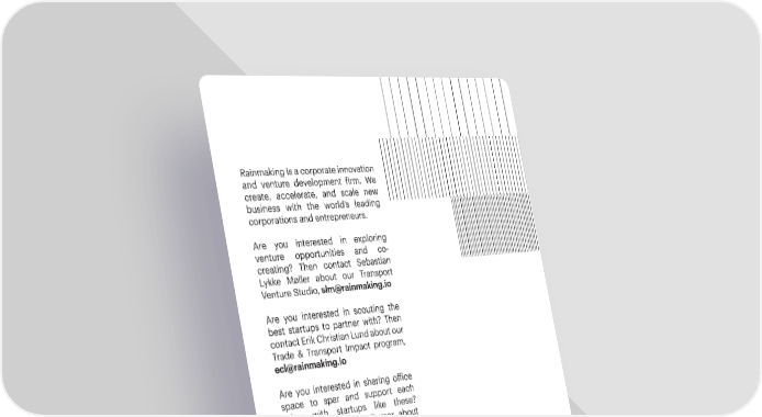 Rainmaking is a corporate innovation and venture development firm. We create, accelerate, and scale new business with the world’s leading corporations and entrepreneurs. Are you interested in exploring venture opportunities and co- creating? Then contact Sebastian Lykke Møller about our Transport Venture Studio, slm@rainmaking.io Are you interested in scouting the best startups to partner with? Then contact Erik Christian Lund about our Trade & Transport Impact program, ecl@rainmaking.io Are you interested in sharing office space to spar and support each other with startups like these? Then contact Annika Rømer about Maritime Innovation Hub at Pier47, ar@rainmaking.io