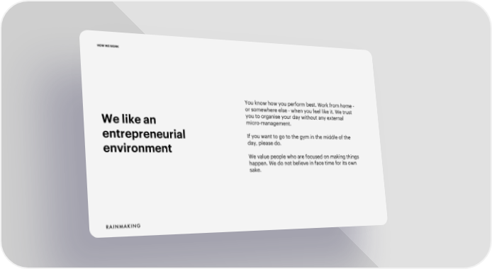HOW WE WORK You know how you perform best. Work from home - or somewhere else - when you feel like it. We trust you to organise your day without any external We like an micro-management. entrepreneurial If you want to go to the gym in the middle of the environment day, please do. We value people who are focused on making things happen. We do not believe in face time for its own sake.