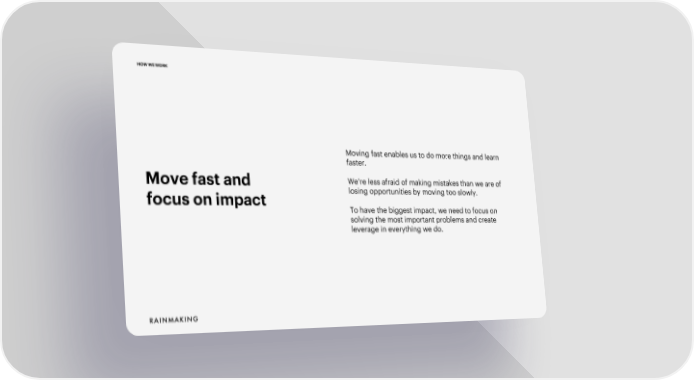 HOW WE WORK Moving fast enables us to do more things and learn faster. Move fast and We’re less afraid of making mistakes than we are of focus on impact losing opportunities by moving too slowly. To have the biggest impact, we need to focus on solving the most important problems and create leverage in everything we do.