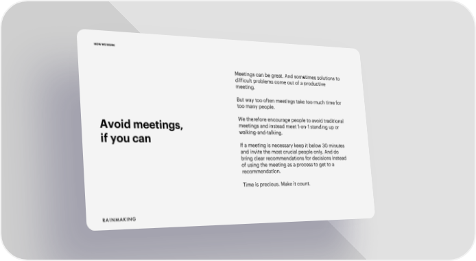 HOW WE WORK Meetings can be great. And sometimes solutions to difficult problems come out of a productive meeting. But way too often meetings take too much time for too many people. We therefore encourage people to avoid traditional Avoid meetings, meetings and instead meet 1-on-1 standing up or if you can walking-and-talking. If a meeting is necessary keep it below 30 minutes and invite the most crucial people only. And do bring clear recommendations for decisions instead of using the meeting as a process to get to a recommendation. Time is precious. Make it count.