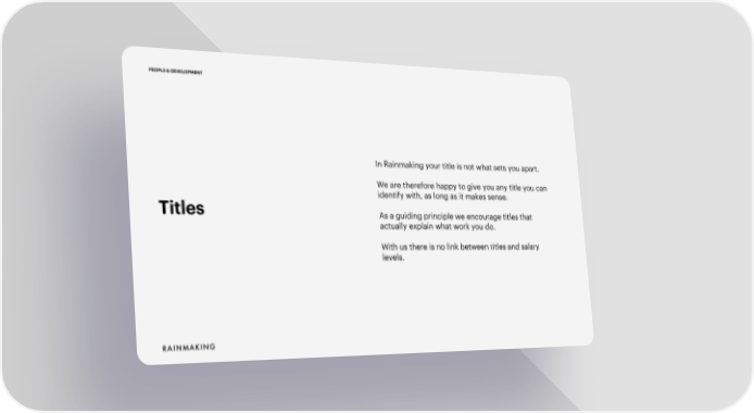 PEOPLE & DEVELOPMENT In Rainmaking your title is not what sets you apart. We are therefore happy to give you any title you can Titles identify with, as long as it makes sense. As a guiding principle we encourage titles that actually explain what work you do. With us there is no link between titles and salary levels.