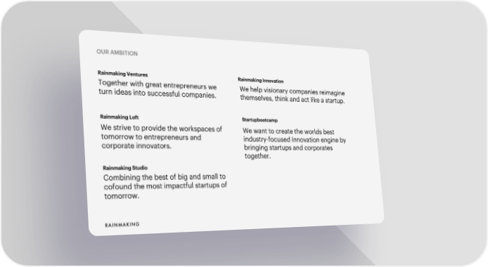 OUR AMBITION Rainmaking Ventures Rainmaking Innovation Together with great entrepreneurs we We help visionary companies reimagine turn ideas into successful companies. themselves, think and act like a startup. Rainmaking Loft Startupbootcamp We strive to provide the workspaces of We want to create the worlds best tomorrow to entrepreneurs and industry-focused innovation engine by corporate innovators. bringing startups and corporates together. RainmakingStudio Combining the best of big and small to cofound the most impactful startups of tomorrow.