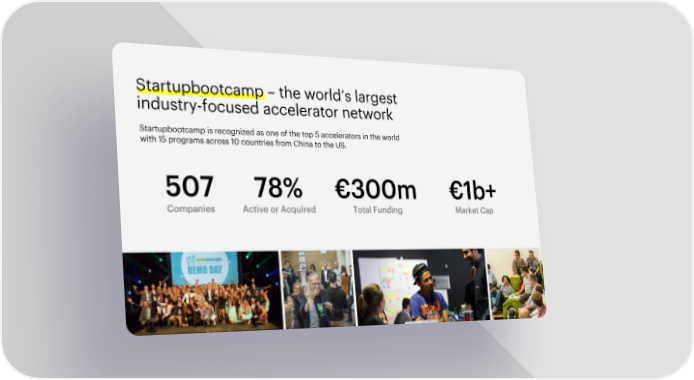 Startupbootcamp–the world’s largest industry-focused accelerator network Startupbootcampis recognized as one of the top 5 accelerators in the world with 15 programs across 10 countries from China to the US. 507 78% €300m €1b+ Companies Active or Acquired Total Funding Market Cap