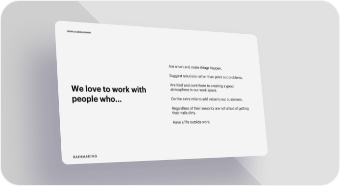 PEOPLE & DEVELOPMENT Are smart and make things happen. Suggest solutions rather than point out problems. Are kind and contribute to creating a good We love to work with atmosphere in our work space. people who... Go the extra mile to add value to our customers. Regardless of their seniority are not afraid of getting their nails dirty. Have a life outside work.