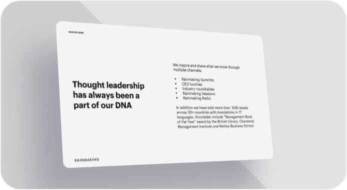 HOW WE WORK We inspire and share what we know through multiple channels: § Rainmaking Summits Thought leadership § CEO lunches § Industry roundtables has always been a § Rainmaking Sessions § Rainmaking Radio part of our DNA In addition we have sold more than 100k books across 30+ countries with translations in 17 languages. Accolades include “Management Book of the Year” award by the British Library, Chartered Management Institute and Henley Business School