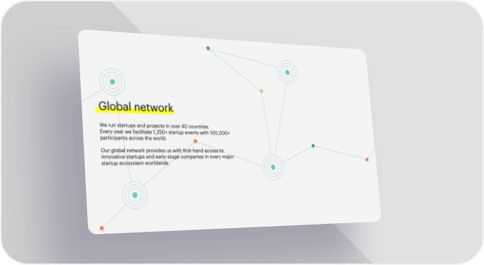 Global network We run startups and projects in over 40 countries. Every year we facilitate 1,250+ startup events with 100,000+ participants across the world. Our global network provides us with first-hand access to innovative startups and early-stage companies in every major startup ecosystem worldwide.