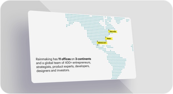 NEW YORK MIAMI MEXICO CITY Rainmaking has 11 offices on 3 continents and a global team of 400+ entrepreneurs, strategists, product experts, developers, designers and investors.