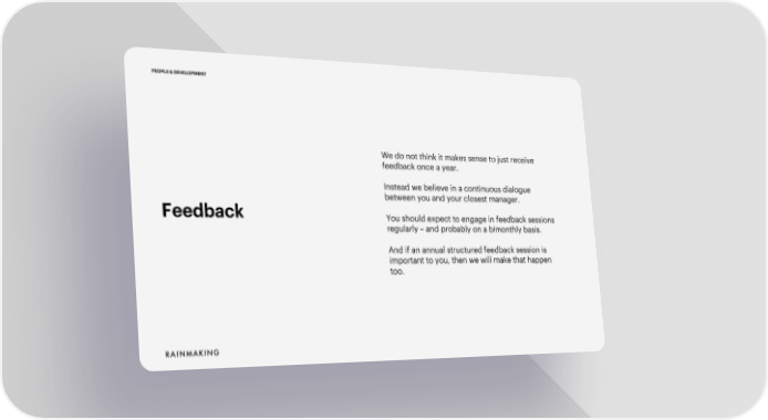 PEOPLE & DEVELOPMENT We do not think it makes sense to just receive feedback once a year. Instead we believe in a continuous dialogue between you and your closest manager. Feedback You should expect to engage in feedback sessions regularly – and probably on a bimonthly basis. And if an annual structured feedback session is important to you, then we will make that happen too.