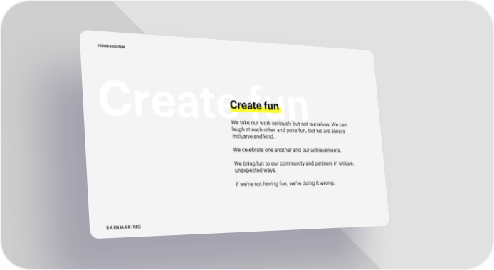 VALUES & CULTURE Create fun Create fun We take our work seriously but not ourselves. We can laugh at each other and poke fun, but we are always inclusive and kind. We celebrate one another and our achievements. We bring fun to our community and partners in unique, unexpected ways. If we’re not having fun, we’re doing it wrong.