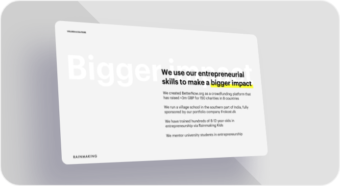 VALUES & CULTURE We use our entrepreneurial Bigger impact skills to make a bigger impact We created BetterNow.orgas a crowdfunding platform that has raised +3m GBP for 150 charities in 8 countries We run a village school in the southern part of India, fully sponsored by our portfolio company Frokost.dk We have trained hundreds of 8-12-year-olds in entrepreneurship via Rainmaking Kids We mentor university students in entrepreneurship