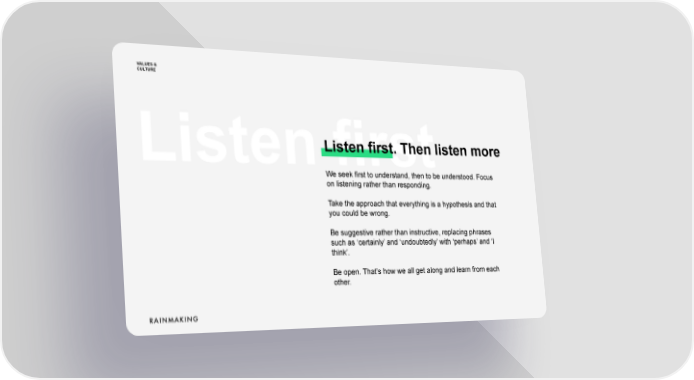 VALUES & CULTURE Listen first. Then listen more Listen first We seek first to understand, then to be understood. Focus on listening rather than responding. Take the approach that everything is a hypothesis and that you could be wrong. Be suggestive rather than instructive, replacing phrases such as 8certainly9 and 8undoubtedly9 with 8perhaps9 and 8I think9. Be open. That9s how we all get along and learn from each other.