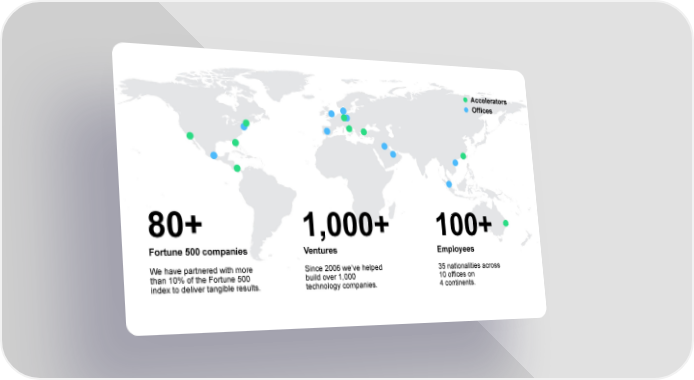 Accelerators Offices 80+ 1,000+ 100+ Fortune 500 companies Ventures Employees We have partnered with more Since 2006 we9ve helped 35 nationalities across than 10% of the Fortune 500 build over 1,000 10 offices on index to deliver tangible results. technology companies. 4 continents. Global team of 250+ entrepreneurs, strategists, product experts, developers, designers, and investors.