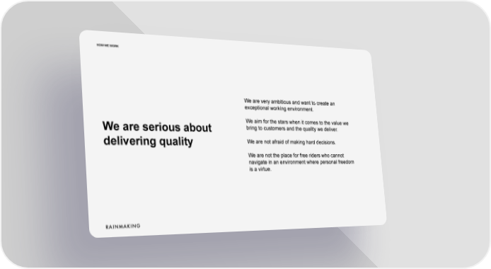 HOW WE WORK We are very ambitious and want to create an exceptional working environment. We aim for the stars when it comes to the value we bring to customers and the quality we deliver. We are serious about We are not afraid of making hard decisions. delivering quality We are not the place for free riders who cannot navigate in an environment where personal freedom is a virtue.