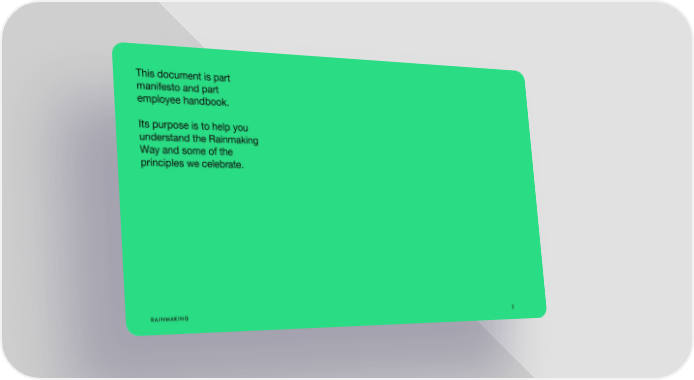 This document is part manifesto and part employee handbook. Its purpose is to help you understand the Rainmaking Way and some of the principles we celebrate. 2