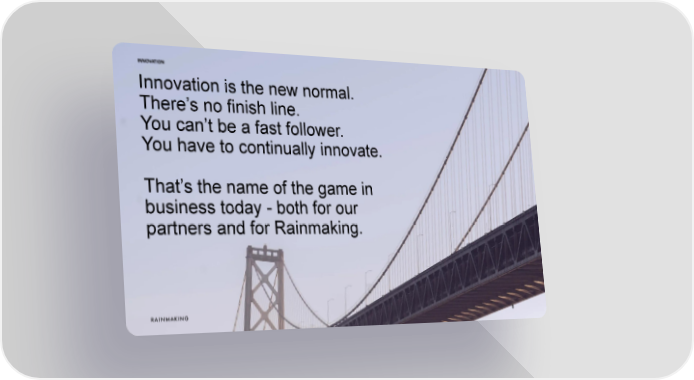 INNOVATION Innovation is the new normal. There9s no finish line. You can9t be a fast follower. You have to continually innovate. That9s the name of the game in business today - both for our partners and for Rainmaking. 8