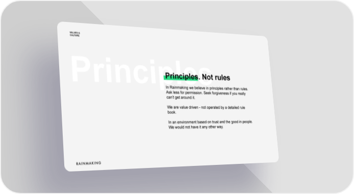 VALUES & CULTURE Principles. Not rules Principles In Rainmaking we believe in principles rather than rules. Ask less for permission. Seek forgiveness if you really can9t get around it. We are value driven - not operated by a detailed rule book. In an environment based on trust and the good in people. We would not have it any other way.
