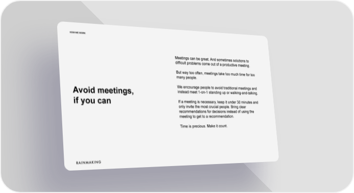 HOW WE WORK Meetings can be great. And sometimes solutions to difficult problems come out of a productive meeting. But way too often, meetings take too much time for too many people. We encourage people to avoid traditional meetings and instead meet 1-on-1 standing up or walking-and-talking. Avoid meetings, If a meeting is necessary, keep it under 30 minutes and if you can only invite the most crucial people. Bring clear recommendations for decisions instead of using the meeting to get to a recommendation. Time is precious. Make it count.