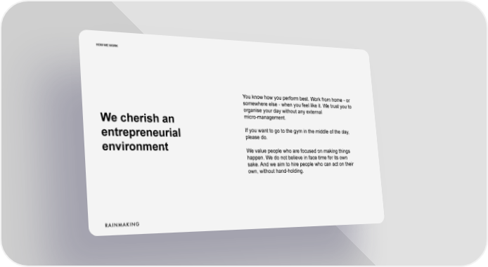 HOW WE WORK You know how you perform best. Work from home - or somewhere else - when you feel like it. We trust you to organise your day without any external micro-management. We cherish an If you want to go to the gym in the middle of the day, entrepreneurial please do. environment We value people who are focused on making things happen. We do not believe in face time for its own sake. And we aim to hire people who can act on their own, without hand-holding.