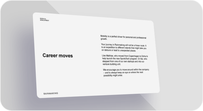 PEOPLE & DEVELOPMENT Mobility is a perfect driver for personal and professional growth. Your journey in Rainmaking will not be a linear route. It is an expedition to different islands that might take you on detours or lead to unexpected places. Like Mathias, who moved from Copenhagen to Doha to Career moves help launch the new SportsTech program. Or Ida, who stepped from one of our own startups and into our venture building unit. We encourage you to move around within the company – and to always keep an eye on where the next possibility might arise.