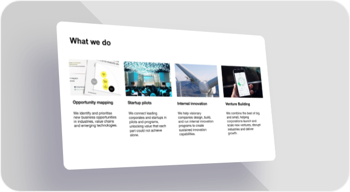 What we do Opportunity mapping Startup pilots Internal innovation Venture Building We identify and prioritise We connect leading We help visionary We combine the best of big new business opportunities corporates and startups in companies design, build, and small, helping in industries, value chains pilots and programs, and run internal innovation corporations launch and and emerging technologies. unlocking value that each programs to create scale new ventures, disrupt part could not achieve sustained innovation industries and deliver alone. capabilities. growth.